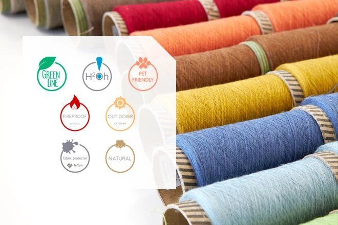 In order to facilitate tracking of the finishes both by our clients and final consumers, we have created a new visual identity. Ho2h, Greenline, Petfriendly, Natural, Fireproof, Outdoor, Fabric protector Teflon are the hallmarks that characterize the finishes of Froca fabrics. Fresh and natural logos that evoke nature and respect for the environment that characterizes us at all times.